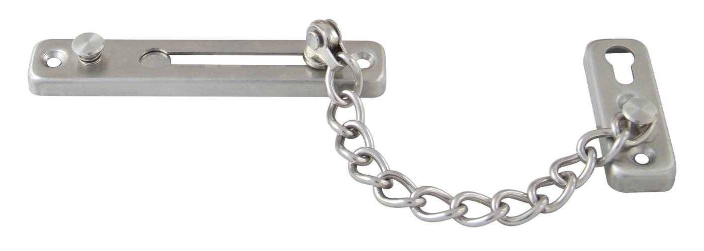 Dørlenke utstyrt med fjærsperre som forhindrer utkobling ved uhell. Rustfritt stål.
