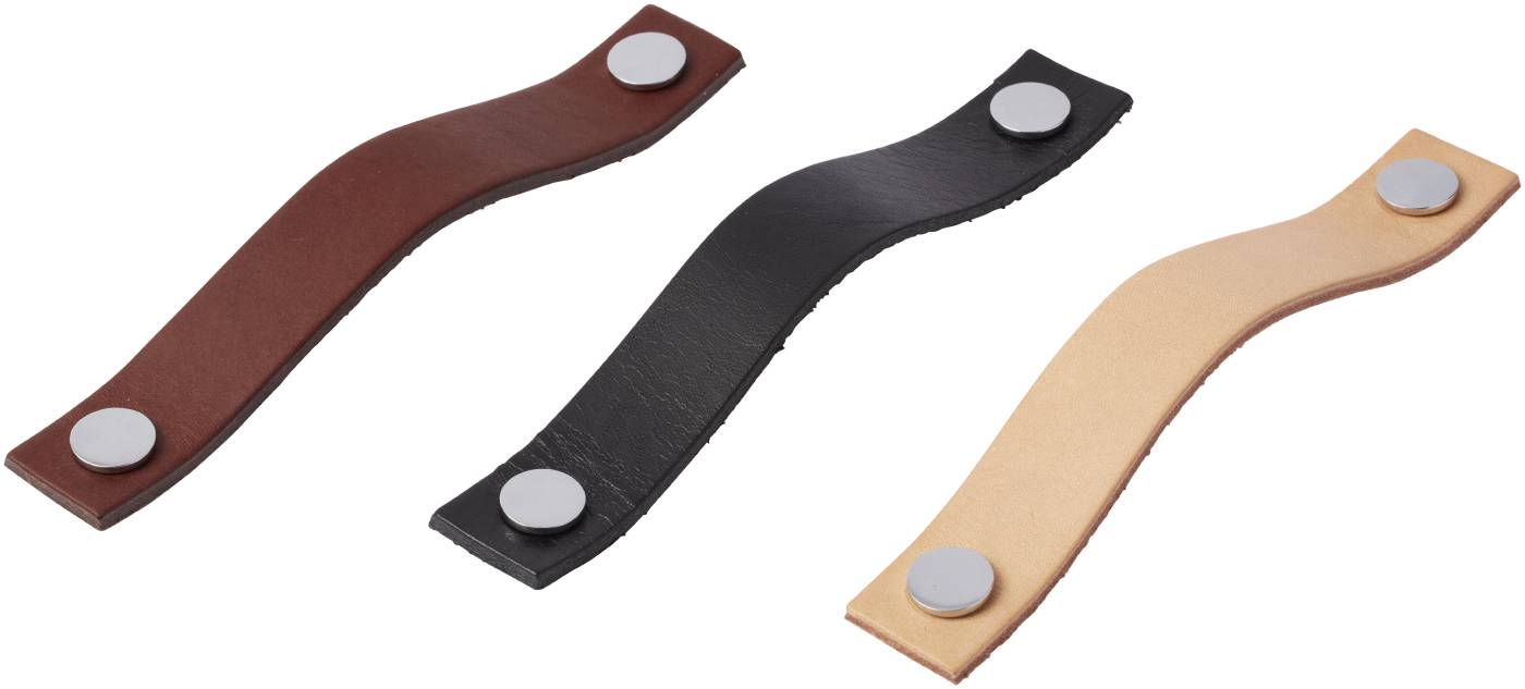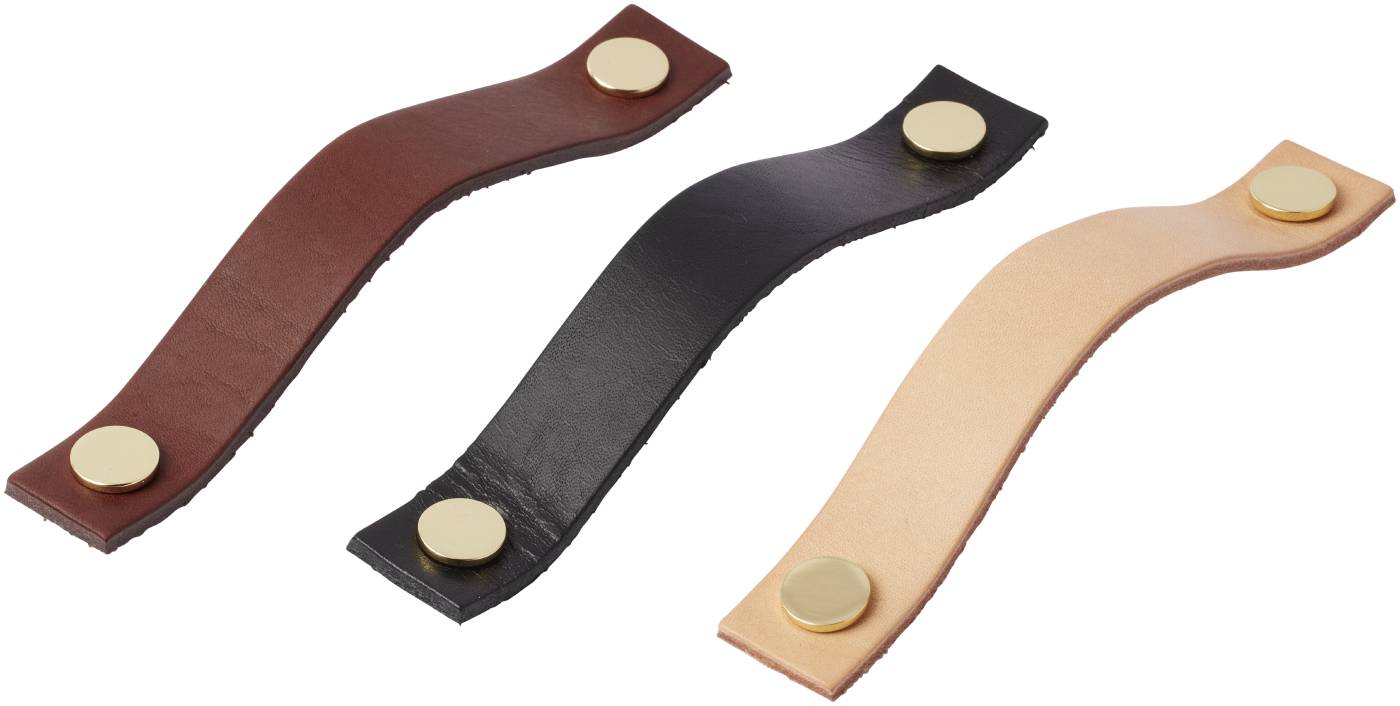 Lærhåndtak til skuffer og skapdører. Leveres i ulike farger. Eksklusiv lærhåndtak med lær fra svenske Tärnsjö Garveri Metalllfester i både messing og krom følger med