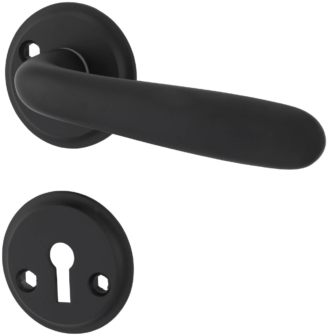 Dørhåndtak for innerdør. Leveres inklusive nøkkelskilt, vriderpinne, nippel og skrue M4.
