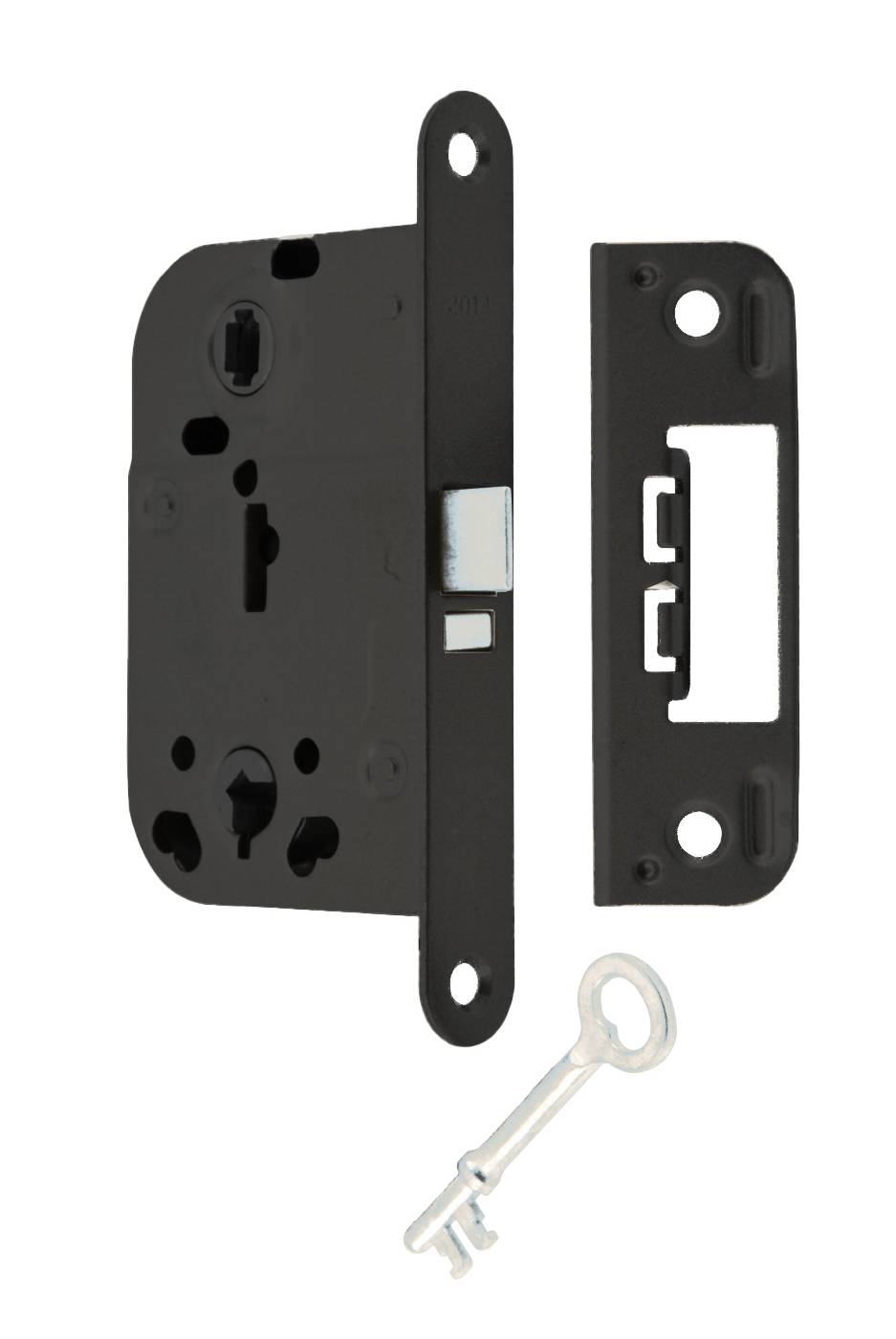 Låskasse for lette innerdører med reile og trykkfalle. Låses med nøkkel eller wc- vrider. 90° nøkkelvridning i reilens bevegelsesretning. Uttrekkbar og vendbar fallestempel for endring høyre/venstre. Leveres med nøkkel og sluttblekk. Dordybde 45mm. Mål stolpe 20x150mm.