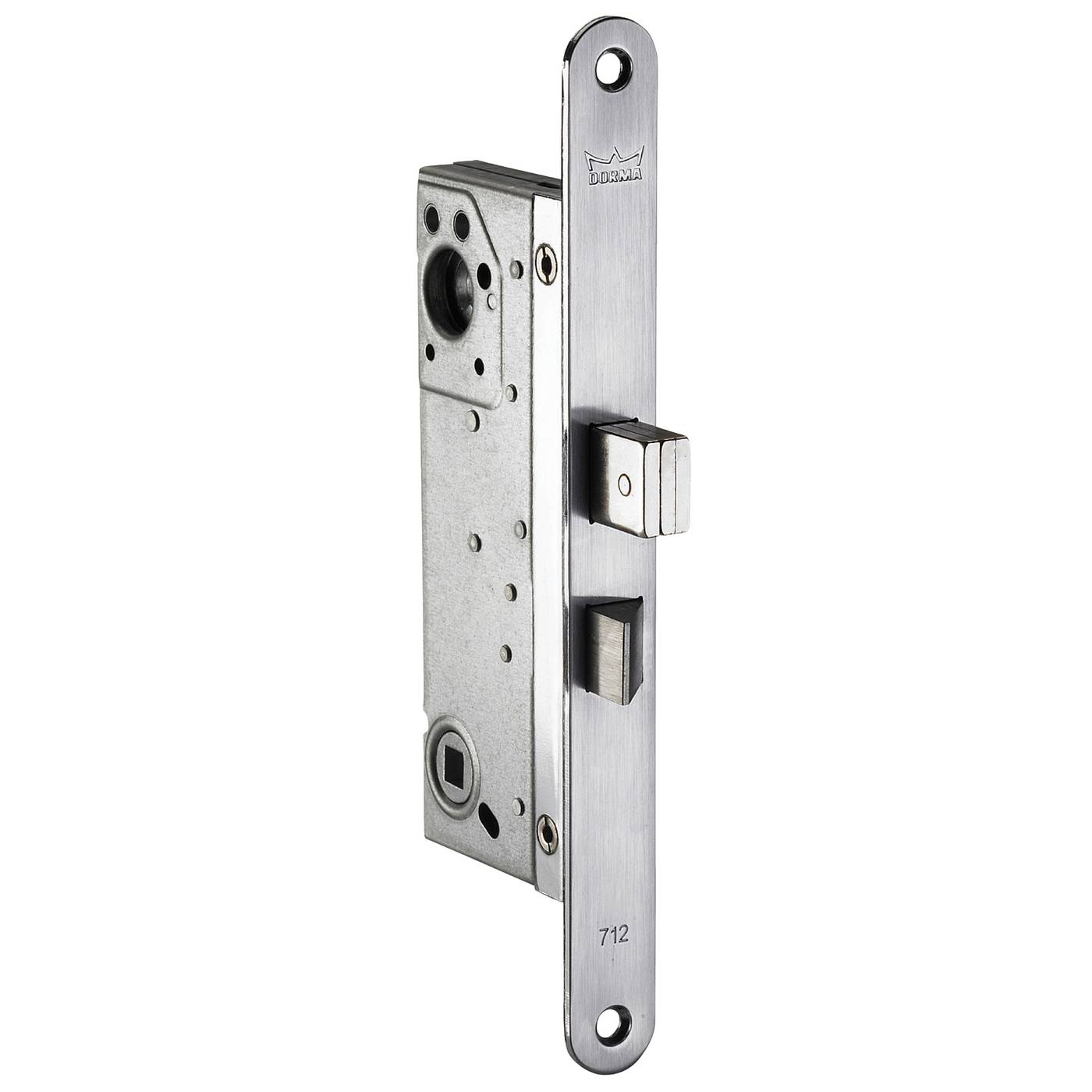 Fallreilelås med symmetrisk mattforkrommet stolpe. Nøkkel eller vrider låser ut og inn reile. Dørvrider drar inn trykkfalle. Nøkkelvridning 90°. Vendbar stolpe for høyre og venstre. Fallestempel og reilestempel av herdet stål. Brukes sammen med låssylinder og sylinderbehør samt sluttstykke. Mål stolpe: 22 mm x 225 mm. Dordybde: 50 mm.