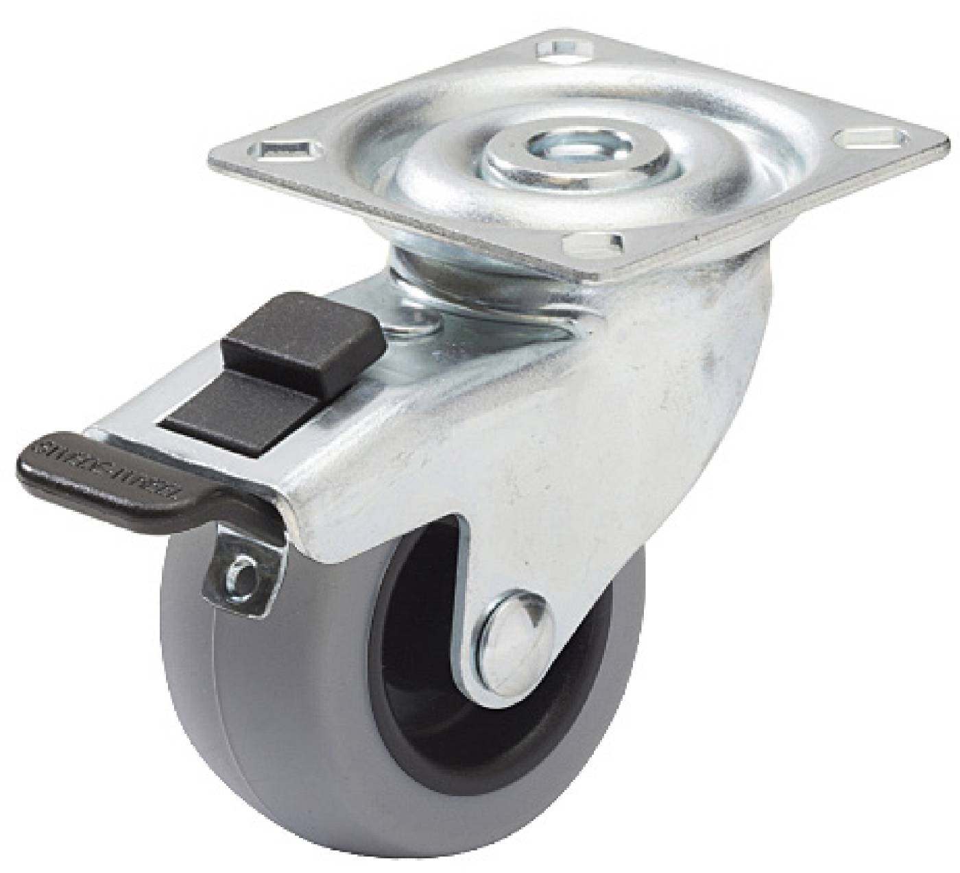 Presset, forzinket stålbøyle med doble kulelager og plate. Naglet hjulaksel, totalbrems. Hjulet er med grå TPE-bane, RAL 7001. Nav i svart PP.