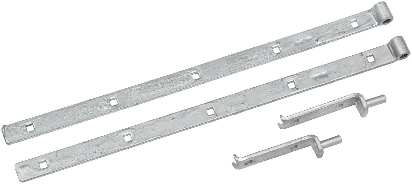 Hakehengsel av stål. Komplett med hake. Hulldimensjon på de firkantede hullene er 11x11 mm og ±0.2. De runde hullene har hulldiameter 10 mm ±0.2. Anbefalt lengde på hakehengsler er at bladet bør dekke minst 60 % av bredden på dør/grind/luke.