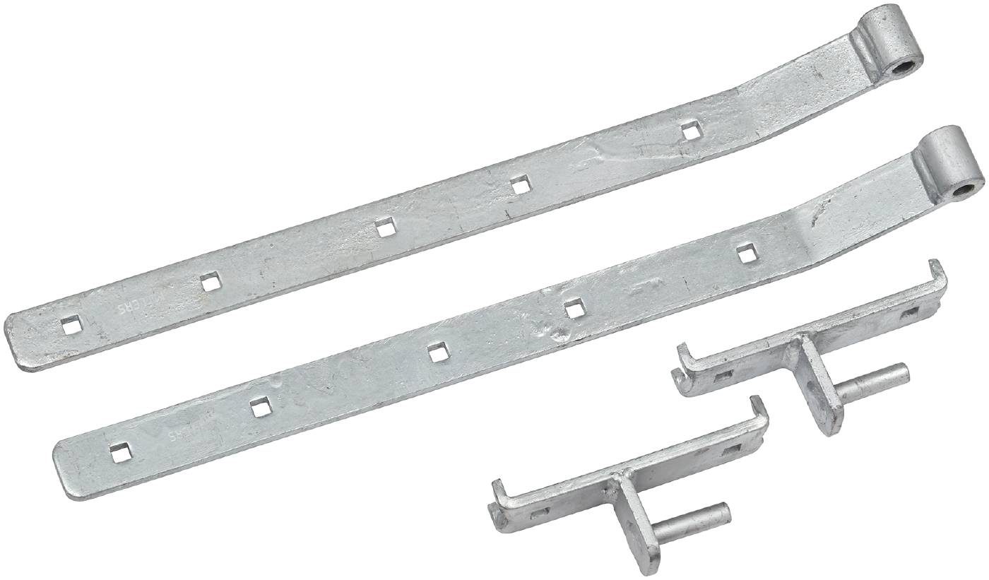Hakehengsel av stål. Komplett med hake. Hulldimensjon på de firkantede hullene er 11x11 mm og ±0.2. De runde hullene har hulldiameter 10 mm ±0.2. Anbefalt lengde på hakehengsler er at bladet bør dekke minst 60 % av bredden på dør/grind/luke.