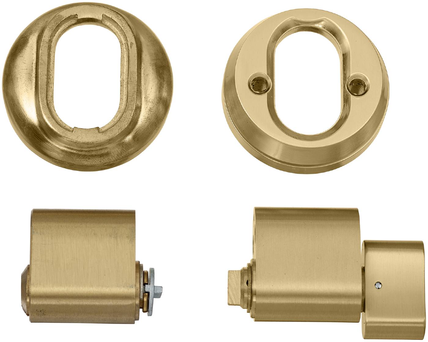 Sylindersett med ovalsylinder utside og vridersylinder innside, og begge med bakkantfeste der fastsetting av sylinderen skjer gjennom låsstolpen. Leveres med sylindere, universal sylinderringer, skrue og forlengerdel 15mm. Bruker der ikke spesielle sikkerhetskrav stilles.