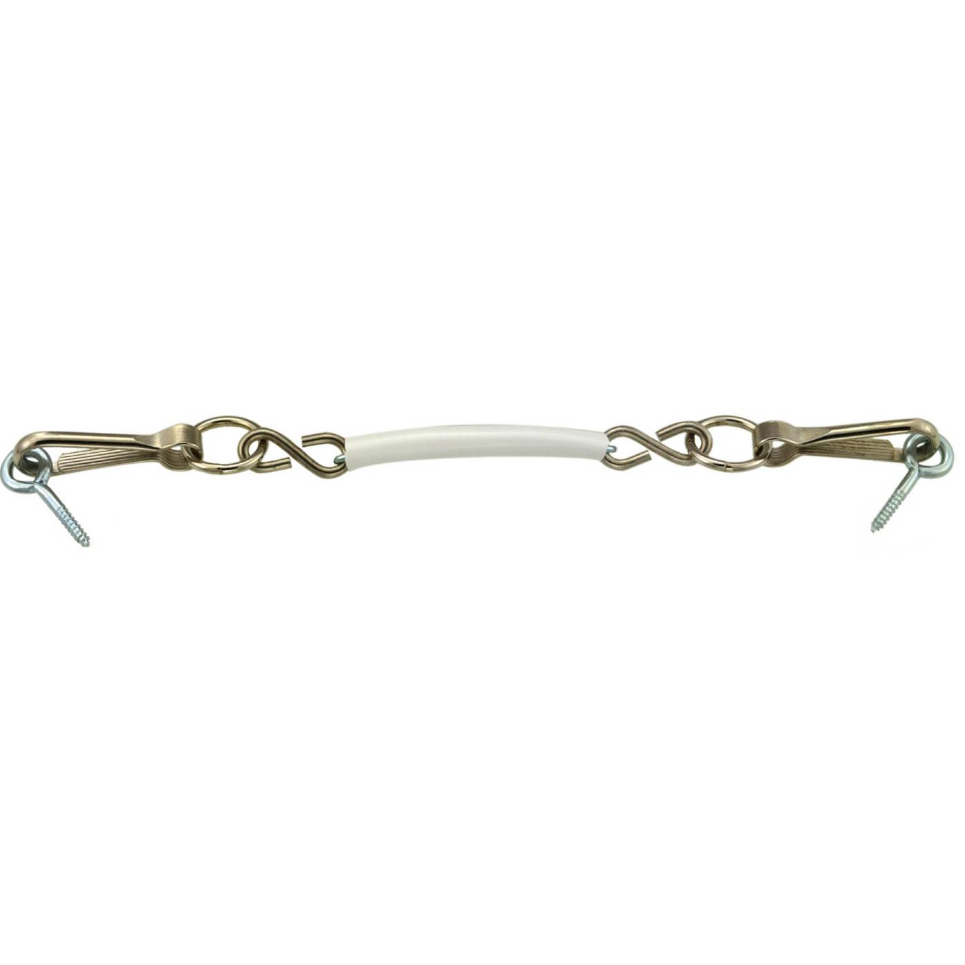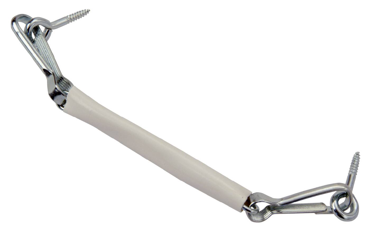 Sikkerhetslenke for vindu og balkongdører. Monteres med øyeskruene lengst opp i vinduskarmen eller døren. Trukket med hvit plastslange. Med karabinkroker og øyeskruer. Ikke barnesikker.