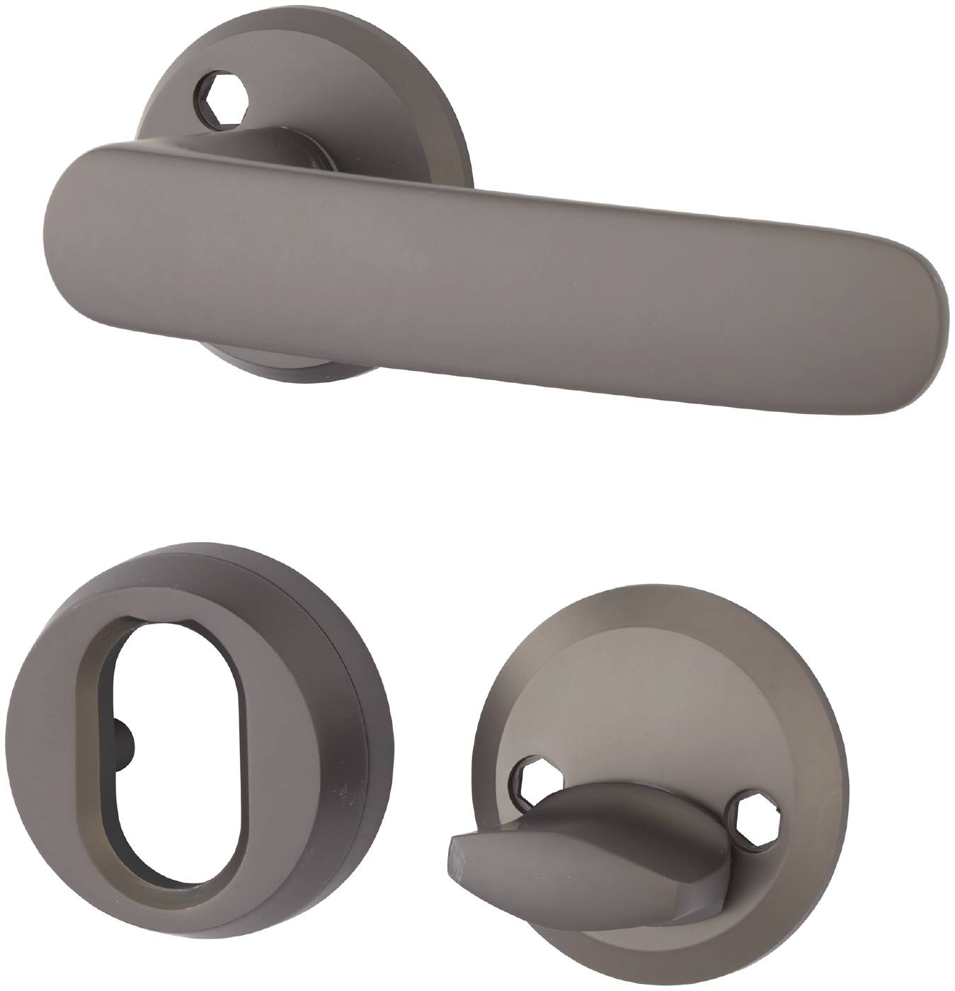 Dørhåndtak for ytterdør uten returfjær. Inklusive sylindergarnityr, vriderpinne og skrue M5.