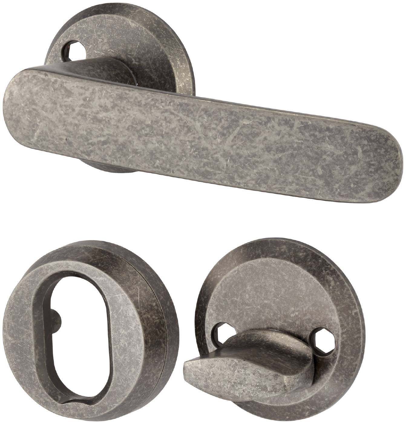 Dørhåndtak for ytterdør uten returfjær. Inklusive sylindergarnityr, vriderpinne og skrue M5.
