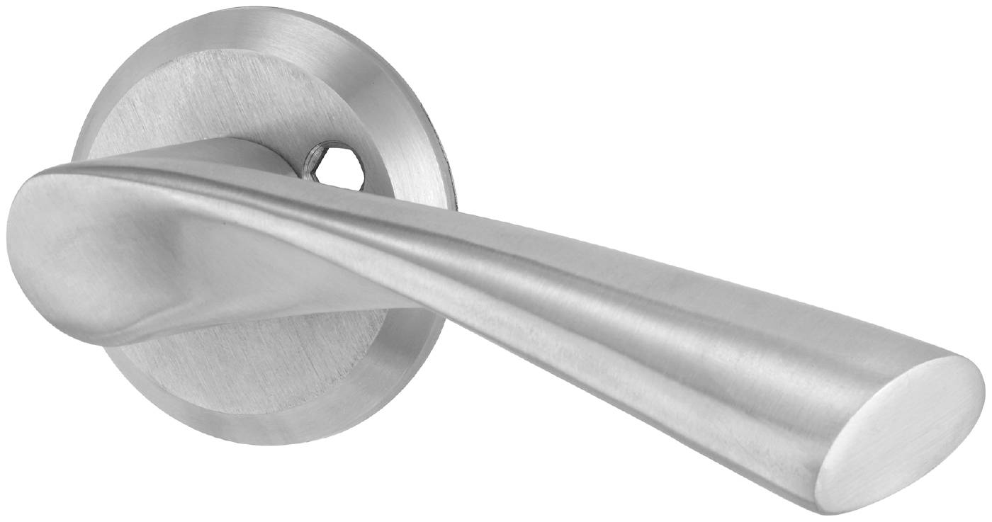 Dørhåndtak for ytterdør med dobbeltvirkende returfjær. Inklusive vriderpinne og gjennomgående skrue M5. OBS! Håndtak, rosett og skrue er i rustfritt stål. Øvrige deler er ikke i rustfritt stål.