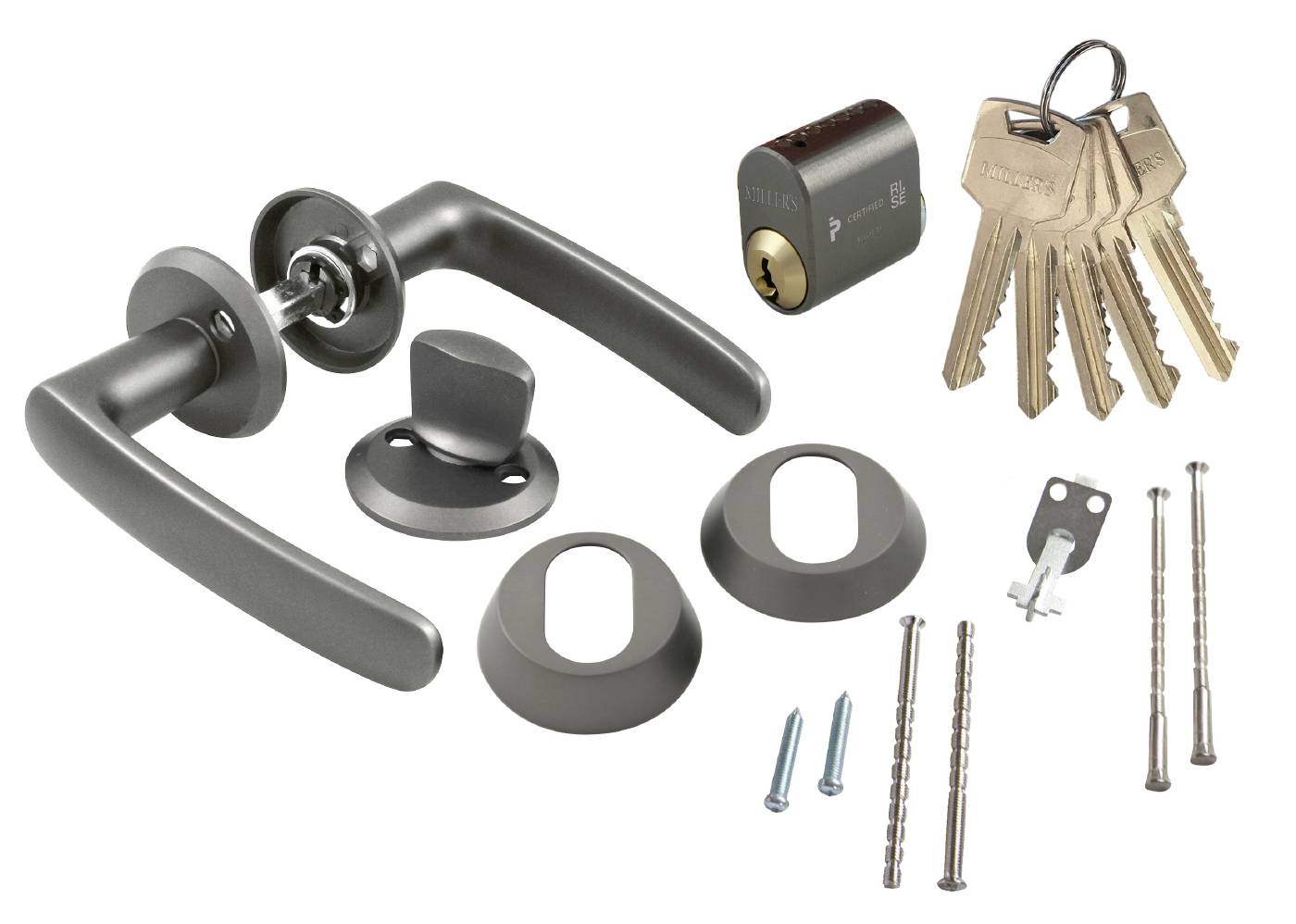 Behörssats. Innehåller: 1 par dörrhandtag, 1 oval låscylinder som uppfyller kraven för SP klass 3; 5 nycklar, 1 cylindervredsats, 2 cylinderringar (11 och 16 mm), 2 roddarpinnar (100 och 120 mm) samt skruvar. För dörrtjocklek 38-70 mm.