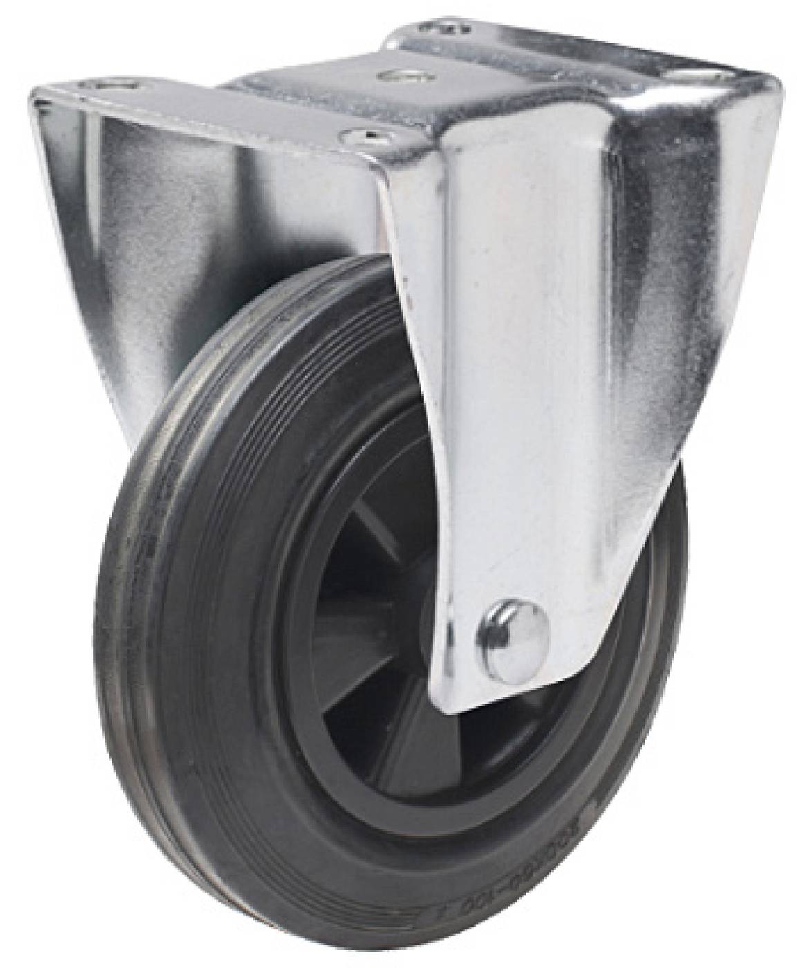 Fast - ej svängbart hjul. Svart nylon med bana av puretan. Pressad, förzinkad plåtbygel med dubbla kulrader och platta. Skruvad hjulaxel. Nav och täckbrickor i svart PA6.
