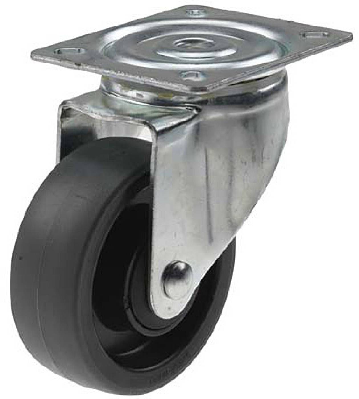 Pressad, förzinkad plåtbygel. Svängkrans med dubbla kulrader och platta. Skruvad hjulaxel. Hjul med precisionskullager grå PUR-bana, RAL 7012. Nav och täckbrickor i svart PA6.