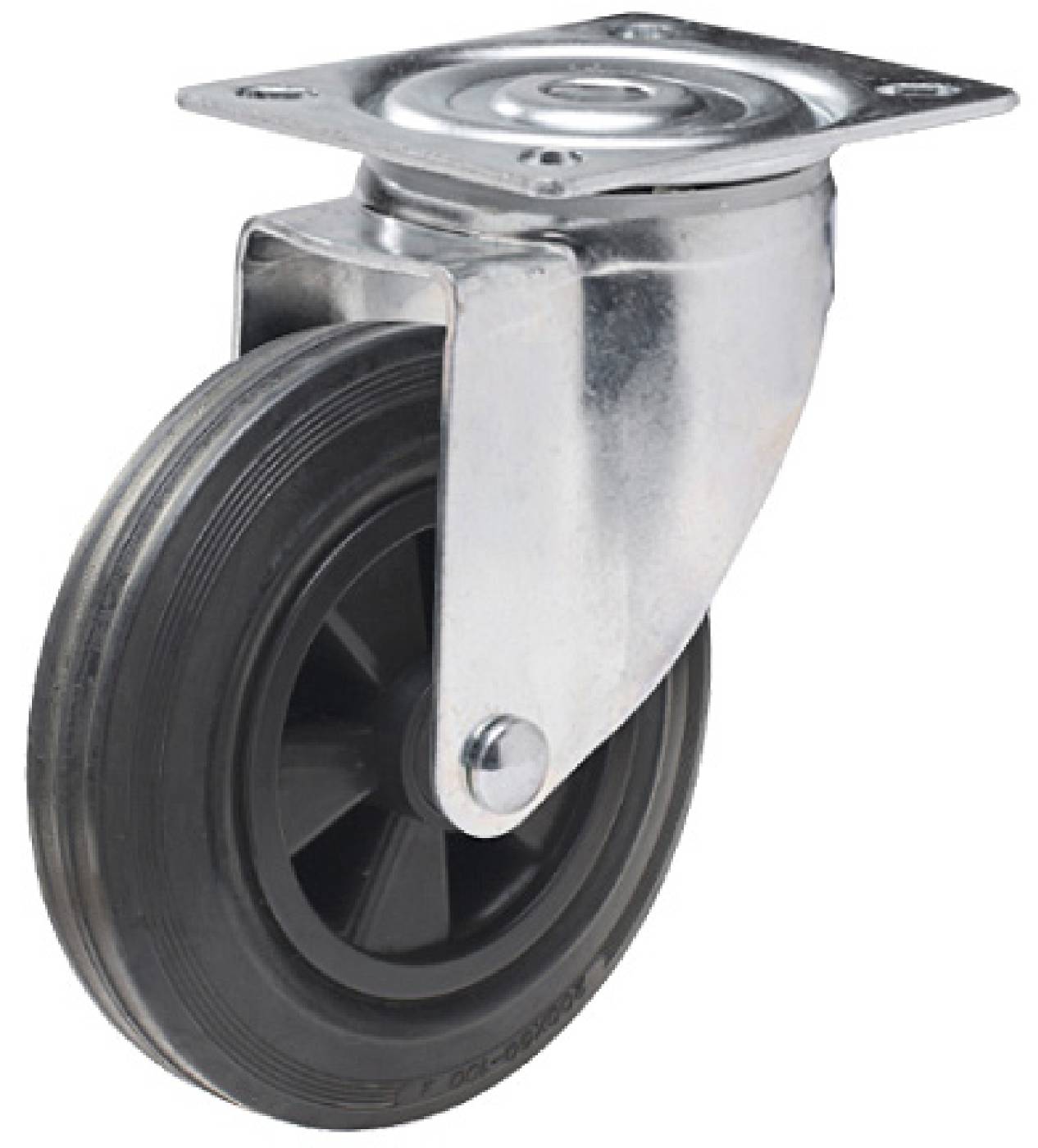 Pressad, förzinkad plåtbygel. Svängkrans med dubbla kulrader och platta. Skruvad hjulaxel. Nav och täckbrickor i svart PA6.
