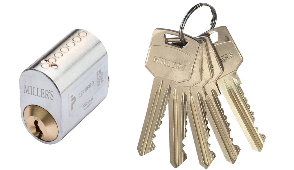 Oval låscylinder i mässing. Levereras med 5st nycklar. 7-stift. För genomgående fastsättning. Uppfyller kraven för klass 3.