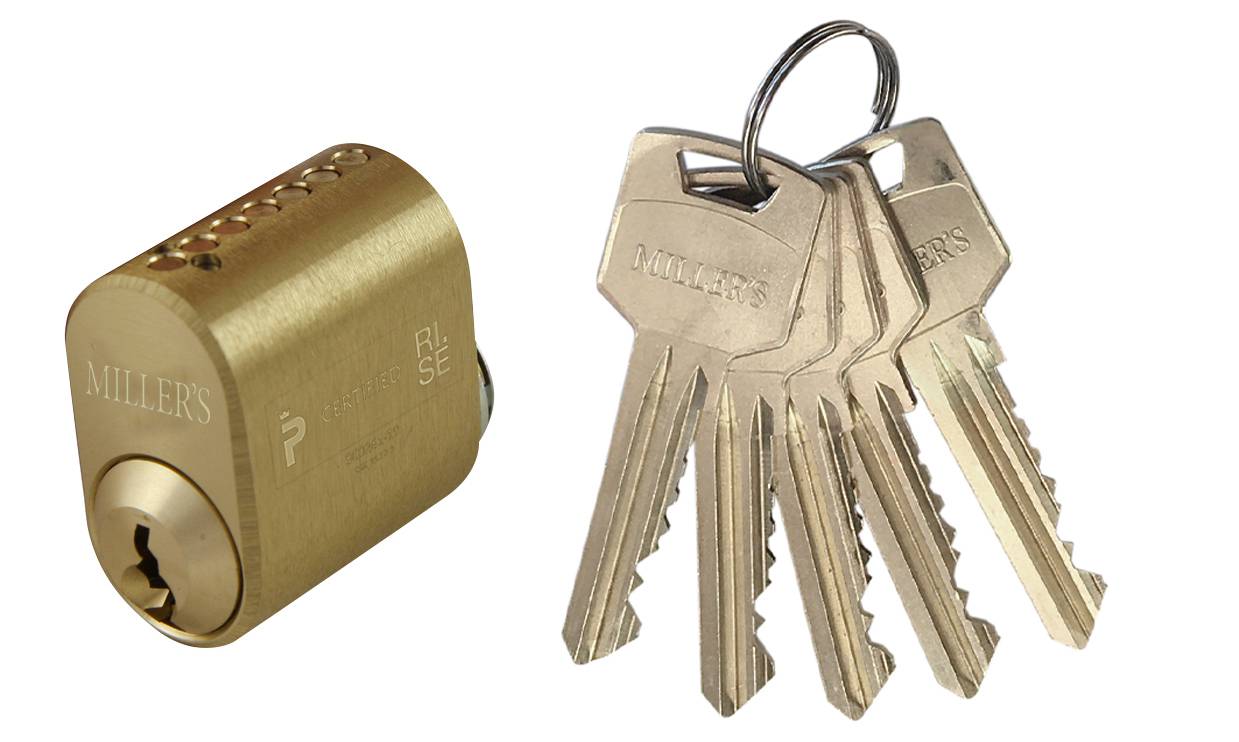 Oval låscylinder i mässing. Levereras med 5st nycklar. 7-stift. För genomgående fastsättning. Uppfyller kraven för klass 3.
