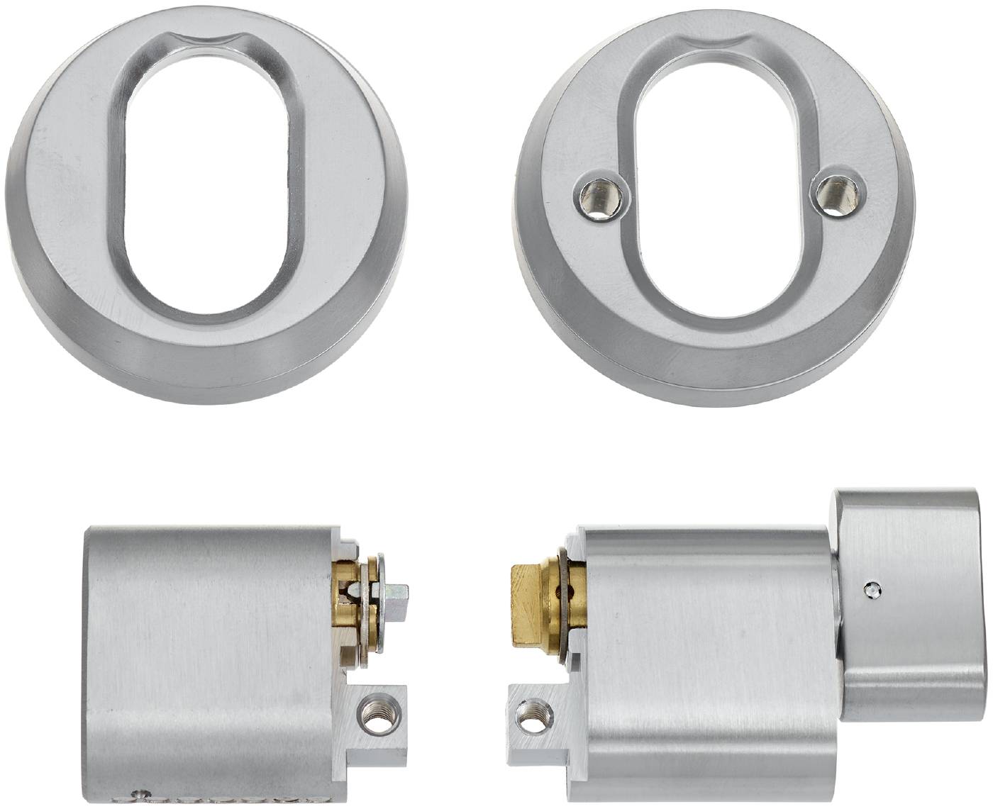 Cylinderset med ovalcylinder utsida och vredcylinder insida för genomgående fastsättning. Levereras med cylindrar, universal cylinderringar, skruv och förläningsdel 12,5mm. Används där inte speciella säkerhetskrav ställs.