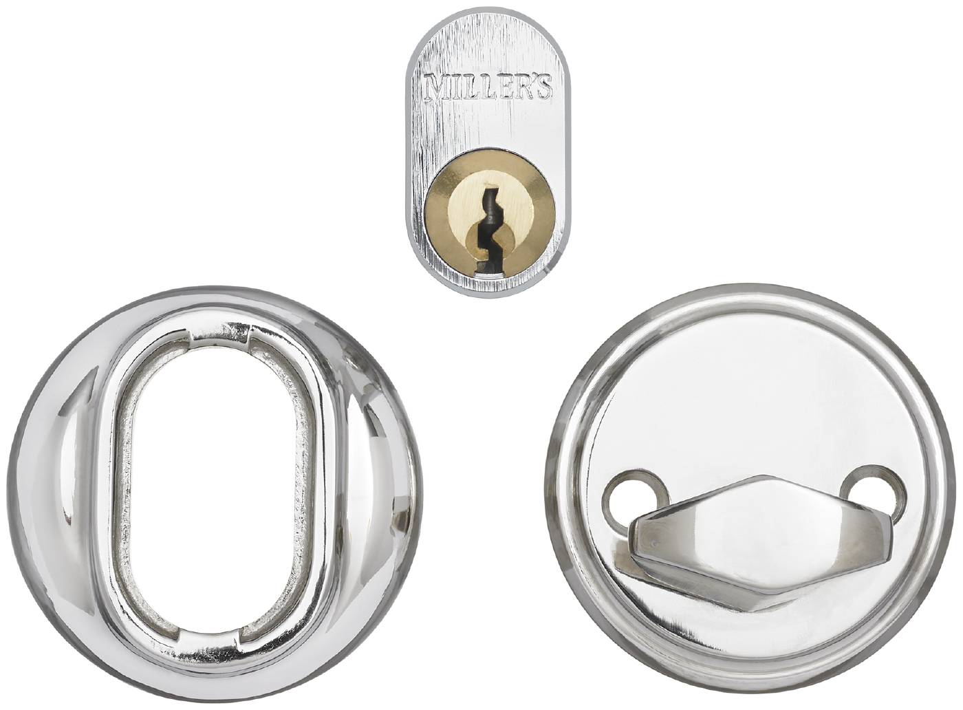 Cylindersats innehållande: Oval cylinder med 5 nycklar, cylinderring universal 8-21mm, vred, vredmedbringare 83mm, cylinderskruv 28mm, vredskruv 90mm.