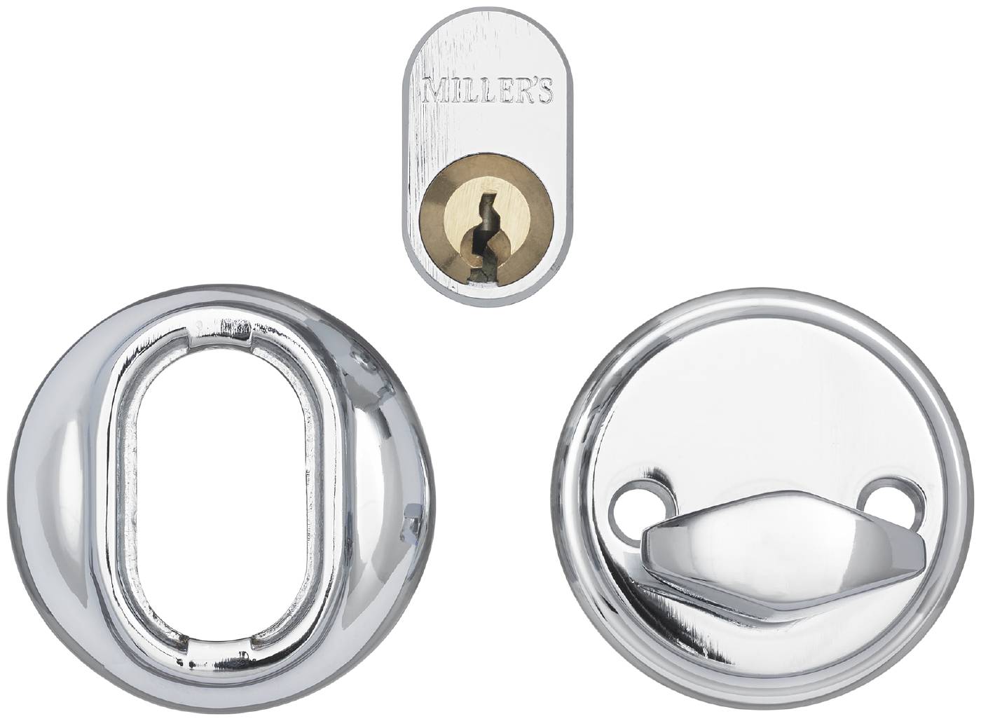 Cylindersats innehållande: Oval cylinder med 5 nycklar, cylinderring universal 8-21mm, vred, vredmedbringare 83mm, cylinderskruv 28mm, vredskruv 90mm.