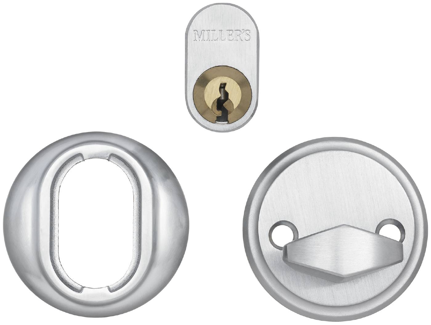 Cylindersats innehållande: Oval cylinder med 5 nycklar, cylinderring universal 8-21mm, vred, vredmedbringare 83mm, cylinderskruv 28mm, vredskruv 90mm.