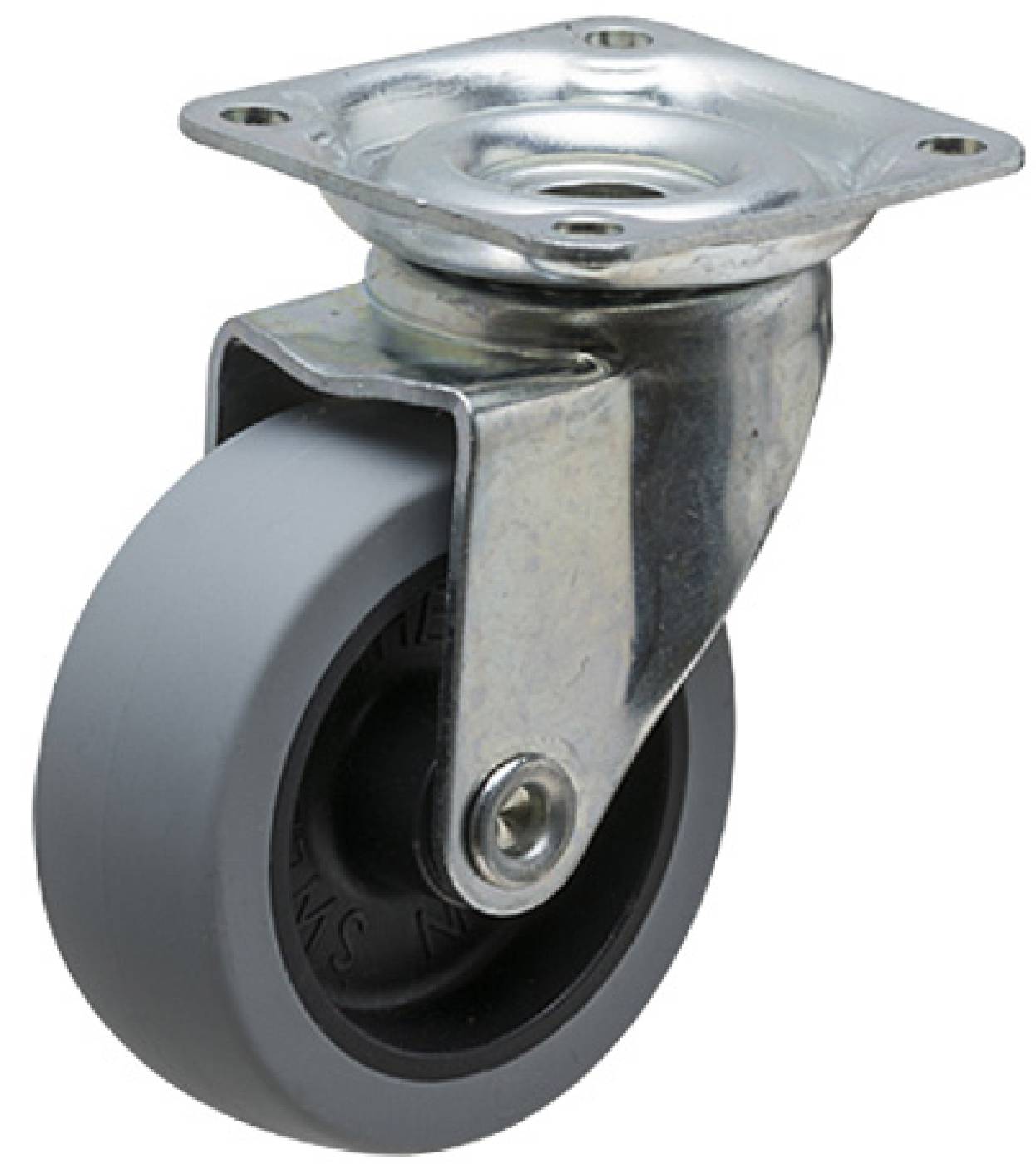 Pressad, förzinkad plåtbygel med dubbla kullager och platta. Nitad hjulaxel. Hjulen är glidlagrade med grå TPE-bana, RAL 7001. Nav i svart PP försett med plasttrådskydd för att skydda det infettade glidlagret.