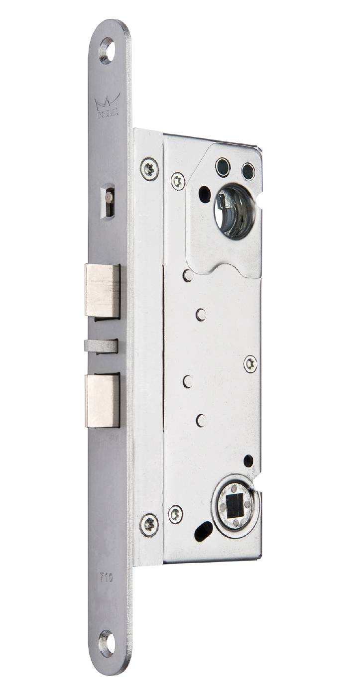 Dubbelfallås med symmetrisk, mattförkromad stolpe. Fallkolvar av härdat stål. Cylinderfall uppställningsbar med knapp eller nyckel. Vändbart höger/ vänster. Dorndjup 50 mm. Mått stolpe 22x225 mm.