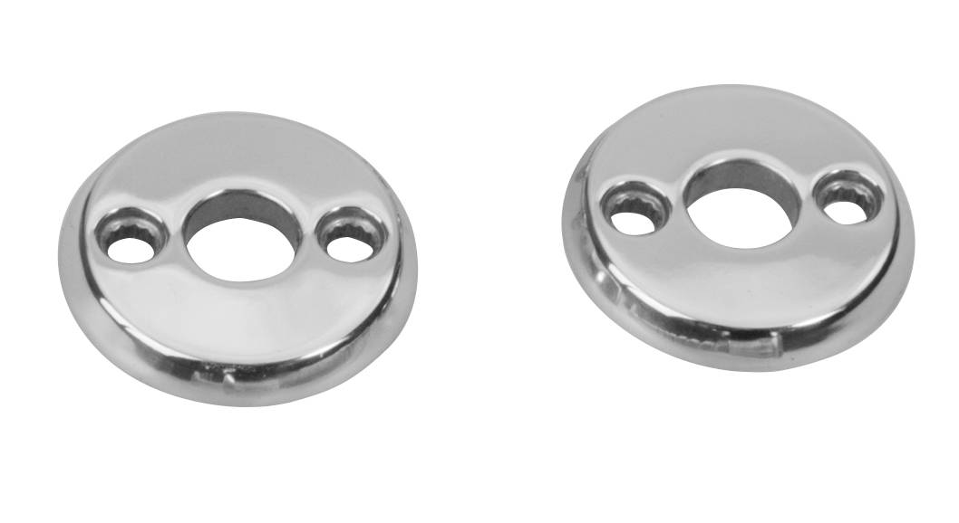 Rosett för dörrhandtag. Anpassad till standard ytterdörr. Diameter 49,5 mm. Centrumhål dia 15 mm. Skruv och nippel medföljer.